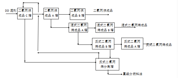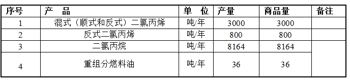产品为混式(顺式和反式)二氯丙烯,反式二氯丙烯,二氯丙烷,重组分燃料油。
