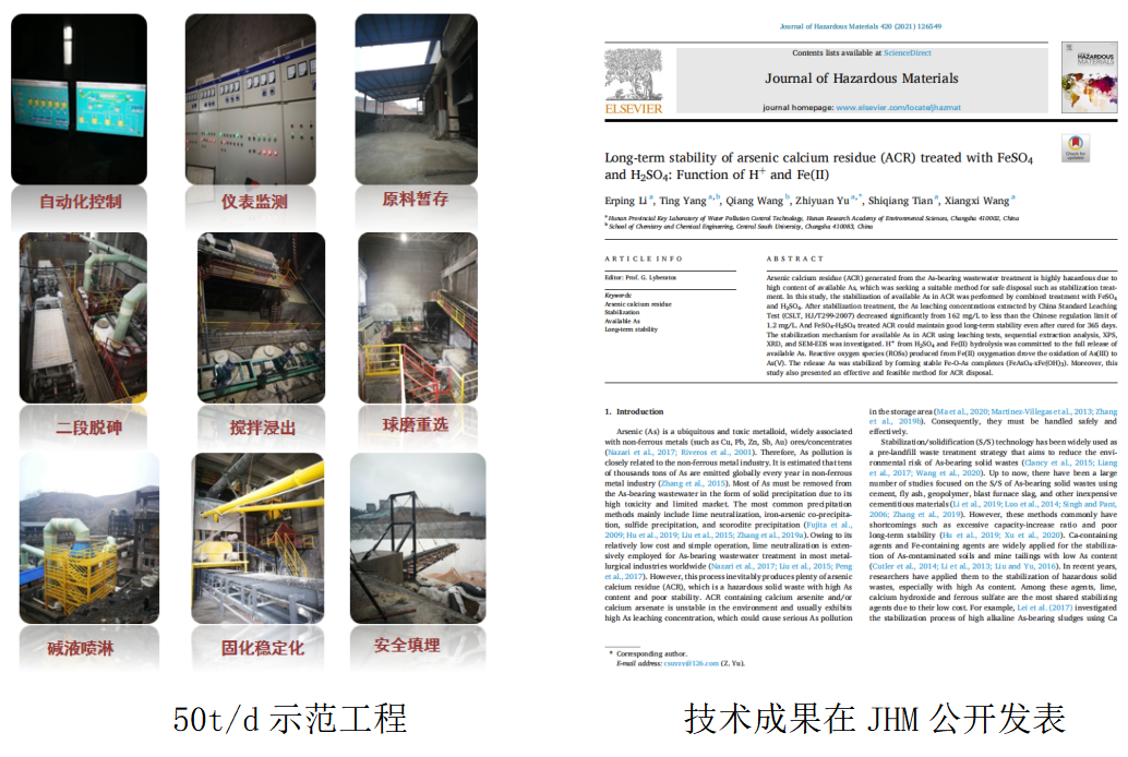 我院固体废物与危化品环境研究所(国家环境保护有色金属工业污染控制工程技术中心)现有人员19人,其中博士学历4人,硕士学历11人,正高技术职称1人,副高技术职称2人,主要负责开展固体废物、危化品和重金属污染防治技术研究及政策、标准、规范研究,为我省固体废物和危险化学品的利用、处置以及重金属污染环境管理提供科技支撑。近年来,该所以“重视基础研究、重点研发实用技术、瞄准技术推广及产业化”为科研发展战略,先后承担湖南省重点研发计划、湖南省自然科学基金、湖南省高新技术产业科技创新引领计划、湖南省战略标准项目等科研项目21项,承接危险废物属性鉴别鉴定、废石尾砂利用论证、重金属污染突出环境问题整改、“无废城市”建设技术方案等特色咨询项目100余项,发表SCI、EI等收录论文12篇,授权发明和实用新型专利15项。湖南辰州矿业有限责任公司是国内唯一一家同时具备锑及锑制品、钨品出口贸易资格和出口供货资质的上市公司。2017年,中央环保督察组将公司厂区内约2.5万吨二次砷碱渣超期贮存问题列为环保督办项目,以该问题为导向,固体所联合企业组建技术攻关团队,在几个省级课题的支持下,将“绿色化学”和“以废治废”融为一体,用简单的原理解决复杂的工业问题,开发了“锑冶炼砷碱渣高校富集与转化稳定化清洁利用技术研发及应用”成套技术,目前已建成50t/d处理规模示范工程,并于2022年9月 25 日完成竣工验收。技术成果在环境领域权威期刊《Journal of hazardous Materials》公开发表。此外,固体废物研究团队围绕重金属与固体废物污染防治工作,注重从咨询业务中挖掘科学问题,取得一批实用性强的技术成果,为建设“无废湖南”提供了智力支持。