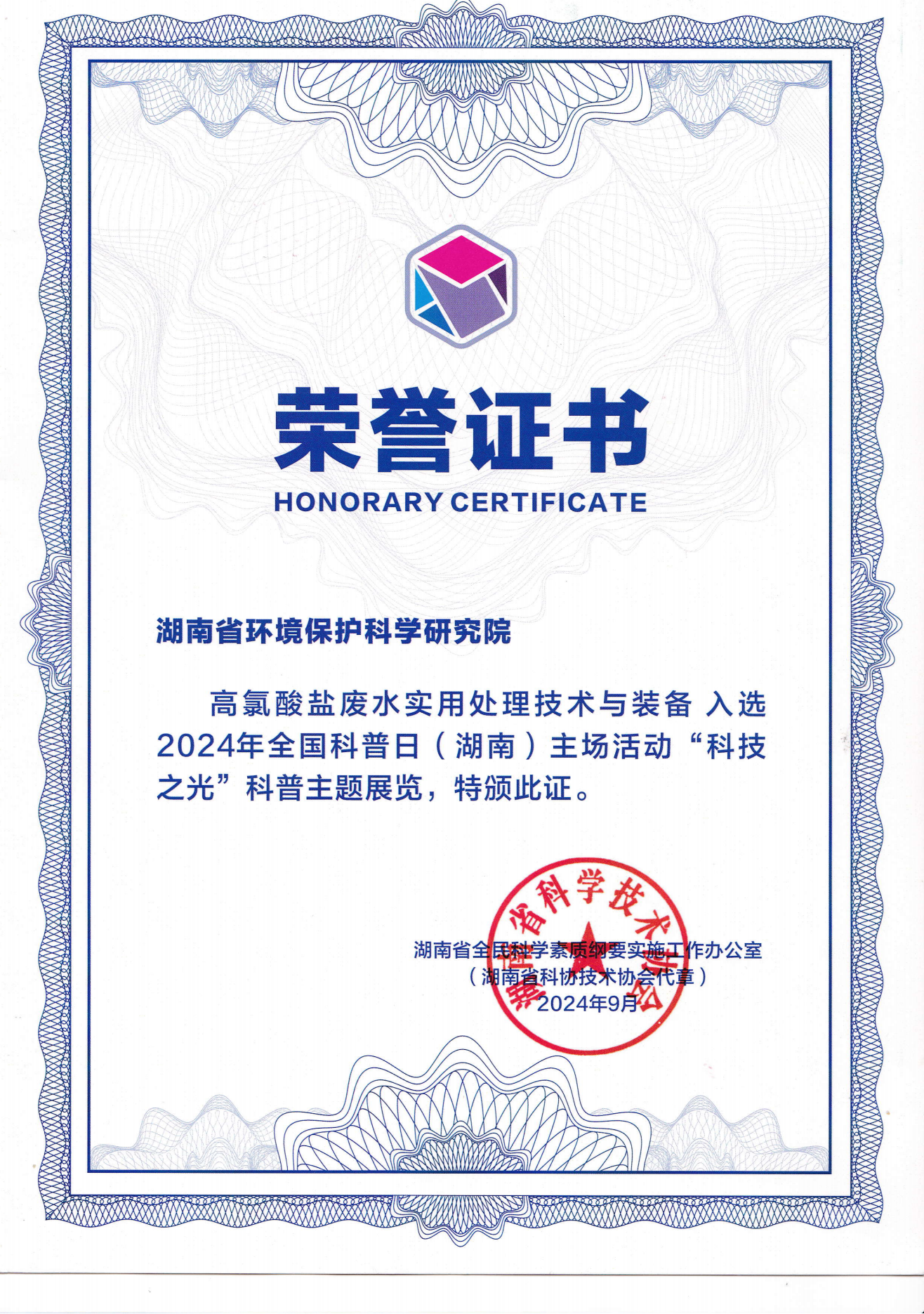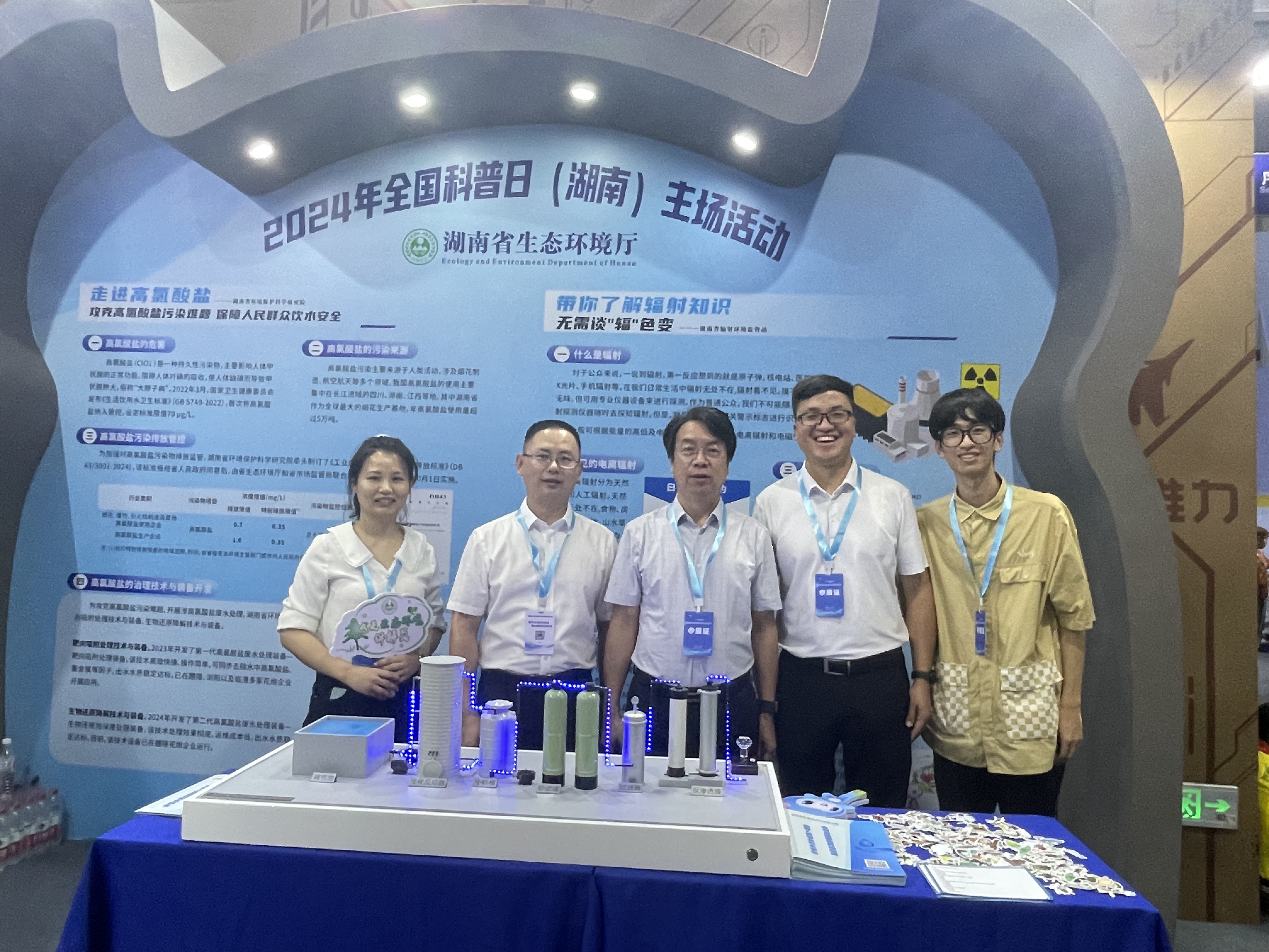 9月14日,2024年全国科普日(湖南)主场活动在省展览馆启动,我院水所开发的高氯酸盐废水处理技术与设备入选此次活动展。在展览现场,我院技术人员通过模型展览、展板展示、讲解介绍、分发宣传册等方式,向参观人员科普了高氯酸盐危害、污染来源、排放管控以及一体化设备等内容,展示了我院在高氯酸盐污染防治攻坚战中取得的阶段性成果。